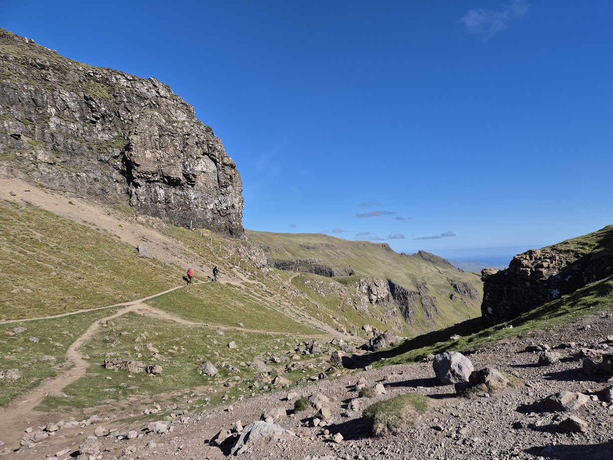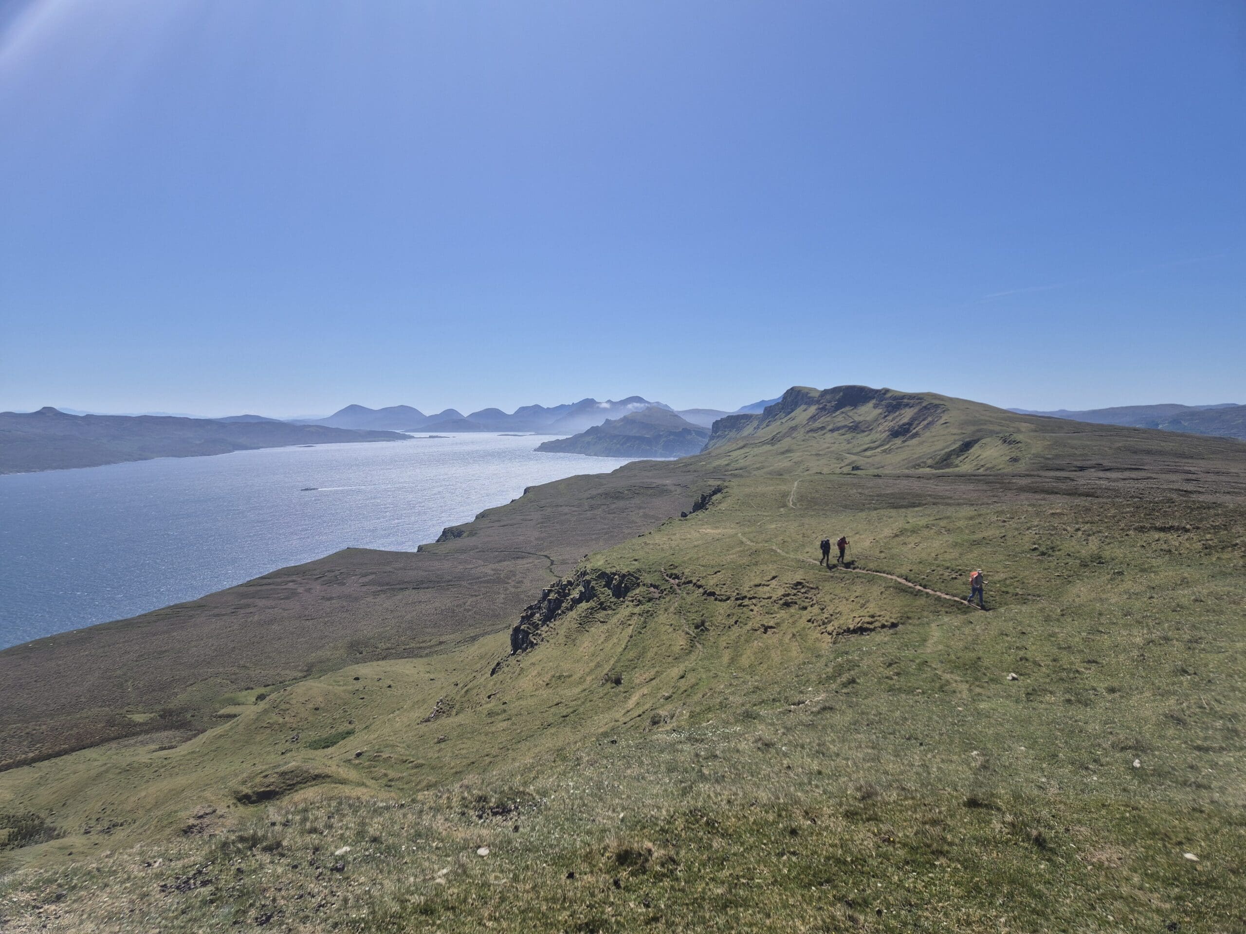 Het busje brengt iedereen naar de parkeerplaats onder de Old Man of Storr. Het eerste busje gaat om 7u en het laatste om 8.30. De dag begint met een klim van 450m naar het uitkijkpunt. Dit stuk is erg toeristisch en bestaat uit een goed onderhouden stenen trap. Eenmaal boven begint direct het onherkenbare ‘pad’ over de Trotternish Ridge. Deze ridge kan je niet halverwege op of af, dus veel mensen kamperen wild halverwege het pad. Van de groep besluiten 3 personen om te keren bij het uitkijkpunt. Fijn is dat Eddie (de driver die ook gids is) mee kan lopen naar boven en een leuke, uitdagende en niet-toeristische route naar beneden weet te verzorgen zodat ook deze groep een mooie dag heeft. De rest loopt deze dag volgens velen, inclusief Judith, ‘de zwaarste route ooit gelopen’. De tocht is een aaneenschakeling van bergtoppen met steile beklimmingen en afdalingen. Het zijn er officieel 7 maar als je gaat tellen kom je op 15. De uitzichten zijn geweldig en vaak 360 graden over land en zee. Het is van alle dagen verreweg de indrukwekkendste. Van de laatste 3 kilometer wordt er nog een kilometer gestegen en die hakt er wel in. De euforie bij aankomst op de parkeerplaats is dan ook (heeeel) groot!