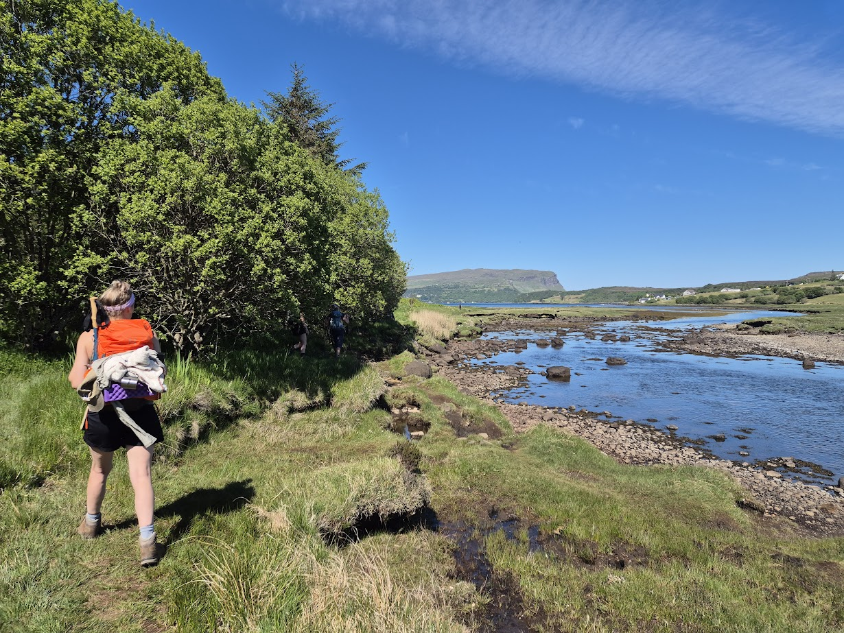 We vervolgen de tocht direct vanaf de campsite, deze lag namelijk midden óp de trail! Het eerste stuk gaat langs de rivier waarbij we ook stukken over de rotsen lopen alvorens we pauze houden met ver uitzicht. Hierna lopen we een klein stuk over de weg en lunchen vroeg om 11.30u op het laatste idyllische strand-stukje voor de laaaange asfaltweg die hierna volgt van 10km. We zien een ouderwetse telefooncel die is omgetoverd tot boekenruilkast en nog in werking zijnde felrode brievenbussen. Een aardige local vertelt ons dat we ook wel over een hek een weiland in kunnen klimmen zodat we een stuk asfalt overslaan wat we maar al te graag doen. Uiteindelijk lopen we 2,5km in de bossen, verdwalen, klimmen een prikkeldraadhek over en komen zo weer terug op de weg. 500m extra gelopen, maar met liefde! Deze weg is helaas de enige die ons naar Portree kan brengen, mocht je kunnen liften zou ik het aanraden ;). Maar dan komen we op een stuk langs de rivier naar het dorpje. Dit stuk is weer heel leuk waarbij we over rotsen en veengrond wandelen tot aan het dorp waar een koud biertje op ons wacht. We eten hier fish & chips (van horen zeggen de beste van heel Schotland) met het grootste deel van de groep en lopen daarna de laatste 2 km naar de campsite voor briefing, stretchen douchen, tent opzetten en SLAPEN.