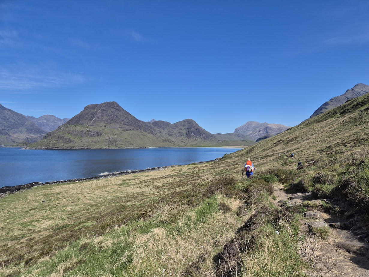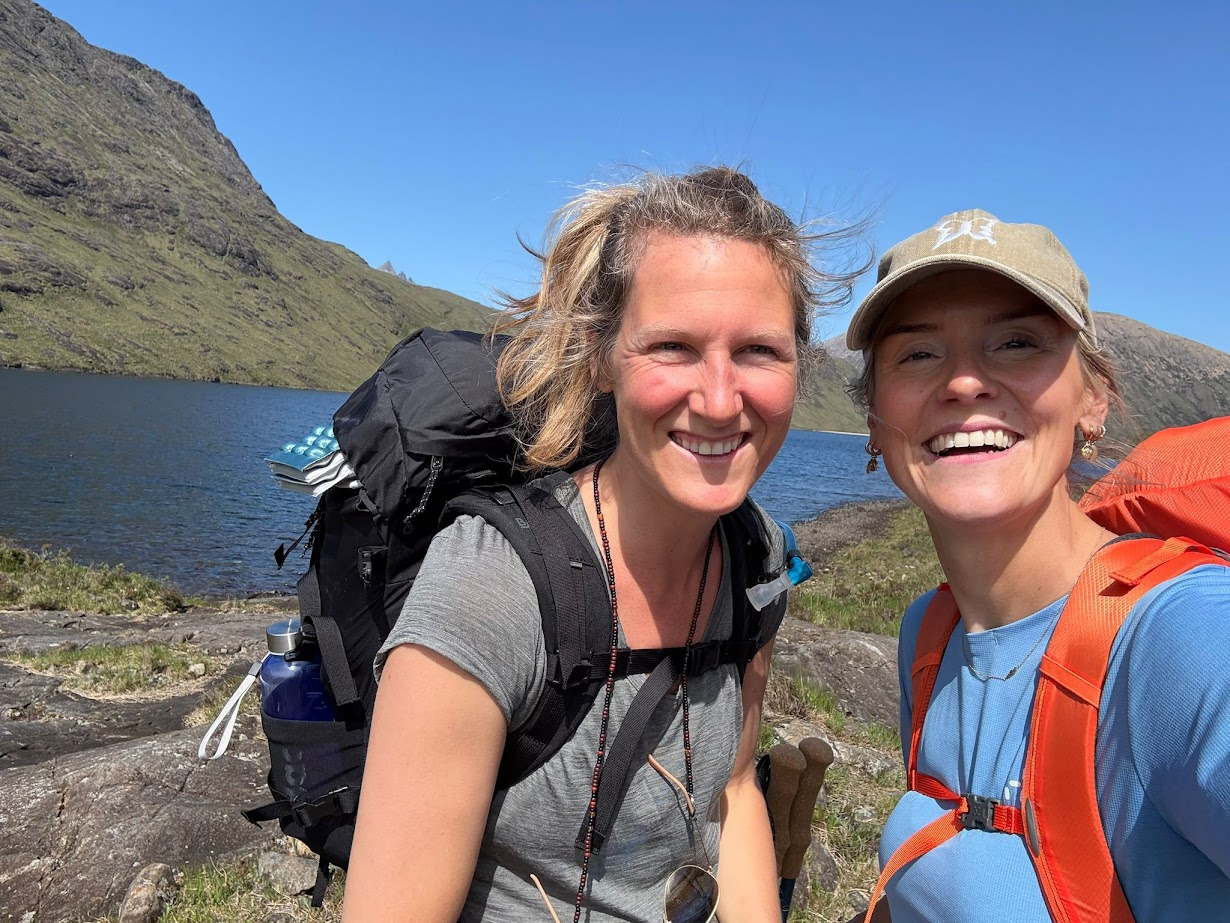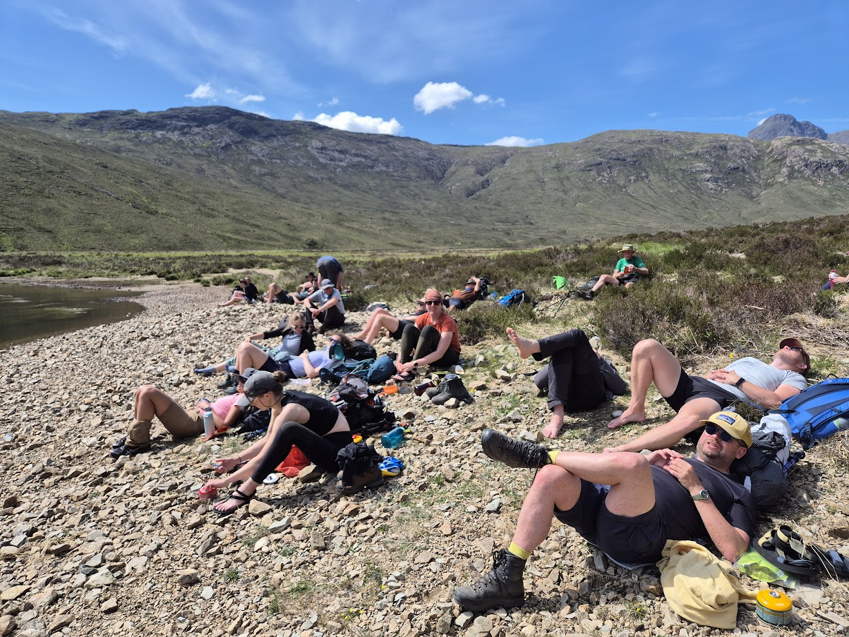 Vroeg wakker vandaag want: tijdsverschil van 1 uur! We pakken alles in, ontbijten naast het riviertje gezellig samen met de midges waarbij 1 reisgenoot een korte broek aan heeft (daar heeft hij wel de hele week spijt van gehad). Na een half uurtje komt de zon verder op en die verdrijft meteen de midges. Heerlijk! We leveren onze grote zware tassen in voor bagagetransport en stretchen met zijn allen voor vertrek. Dit alles met prachtig uitzicht. Dit is wel de meest basic camping, maar gelijk ook de mooiste met zicht op de zee en wat kleine bootjes.