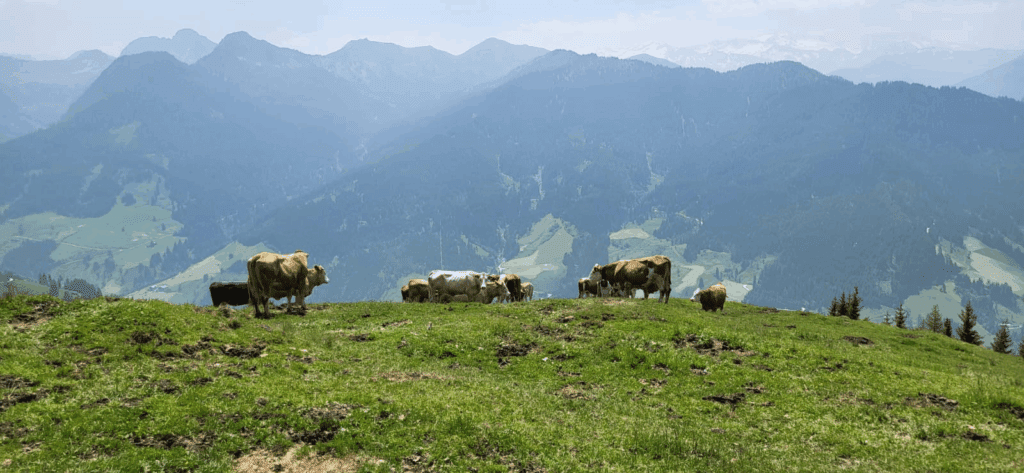 Vandaag begint met een flinke stijging weer terug naar de Penkkopf top en gaat daarna over op leuke bospaadjes afgewisseld met alpenweides met het meest fenomenale uitzicht. Zo zien we precies waar we gister allemaal hebben gelopen, maar dan van onderaf. Onderweg hebben we mooie gesprekken met elkaar, maar ook weer een stuk waarop we in stilte wandelen en kunnen reflecteren over wat deze tocht met ons heeft gedaan.