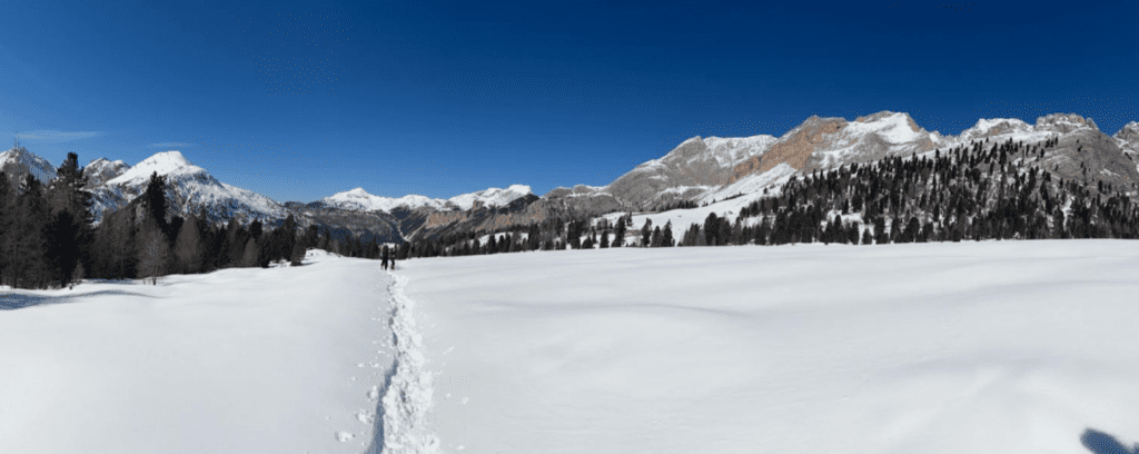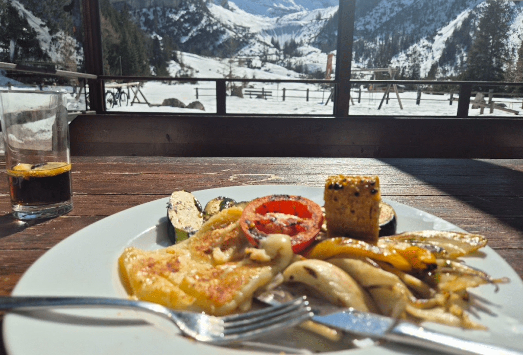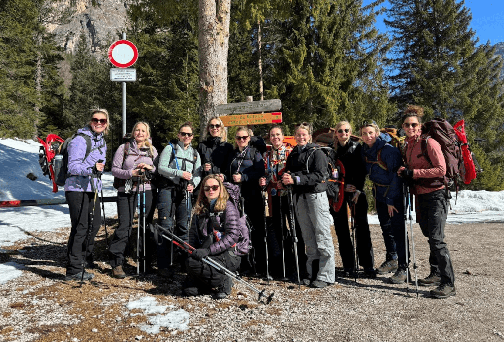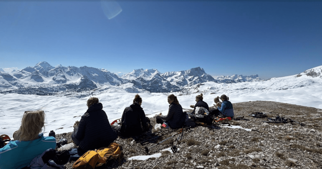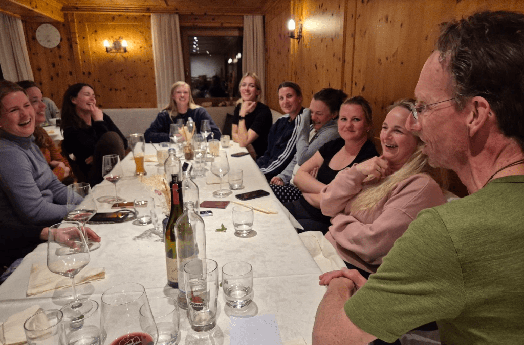 In de app hadden zich carpool groepjes gevormd en vandaag kwam iedereen aan met 4 auto’s totaal. Hotel Dolomiten in Toblach, was voor de meesten ongeveer 12 uur rijden. Sommigen hadden er al wat wandeldagen aan vastgeplakt in Oostenrijk en iemand was in Italië blijven plakken na een andere wintersportreis. Jan kwam met de trein, wat ook prima kan via Innsbruck met de nachttrein. Het hotel gaf ons een warm welkom met de wellness inclusief sauna, stoomcabine, warmwaterbed en infraroodsauna, waarna we genoten van een welverdiend eerste aperolletje. De groep is heel gezellig met 12 vrouwen tussen de 27 en 40 jaar, dit belooft weer een leuke reis te worden! Het diner was uitgebreid met salade bar, voorgerecht, hoofdgerecht en tiramisu en Jan liet ons in de avond zien hoe de route zou gaan en hoe alle lawine gear werkt. Vroeg naar bed want morgen hebben we de zwaarste dag voor de boeg!