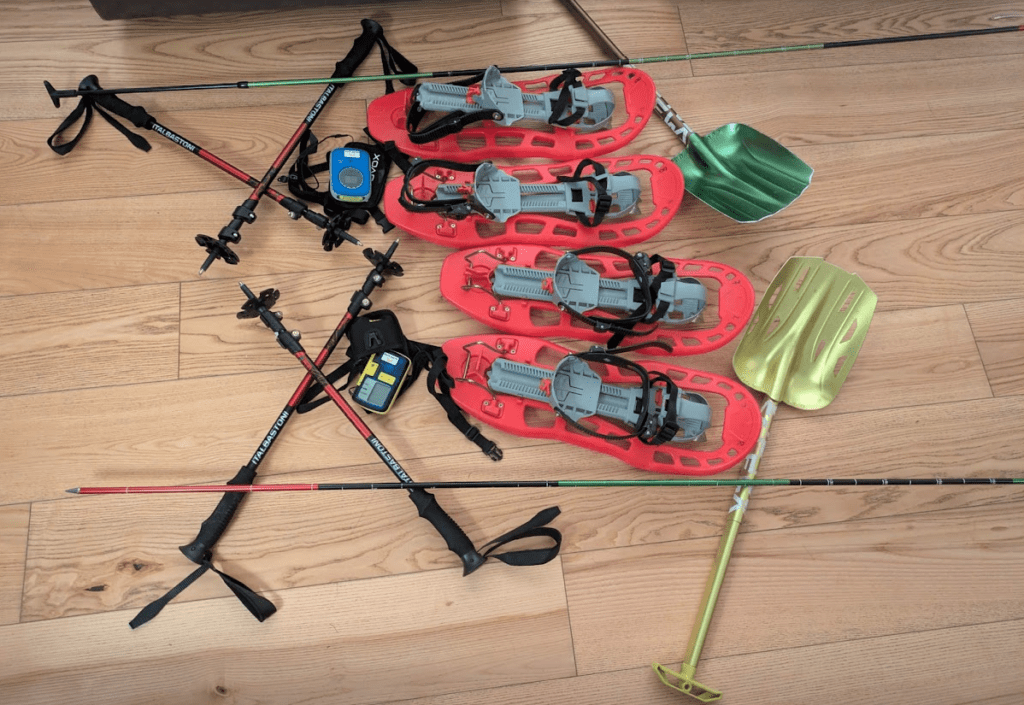 Je krijgt van de gids sneeuwschoenen, wandelstokken en lawine-uitrusting bestaande uit een sonde, lawineschep en een pieper. Deze zaken hoef je dus niet zelf mee te nemen maar houdt er rekening mee qua ruimte in je dagrugzak.