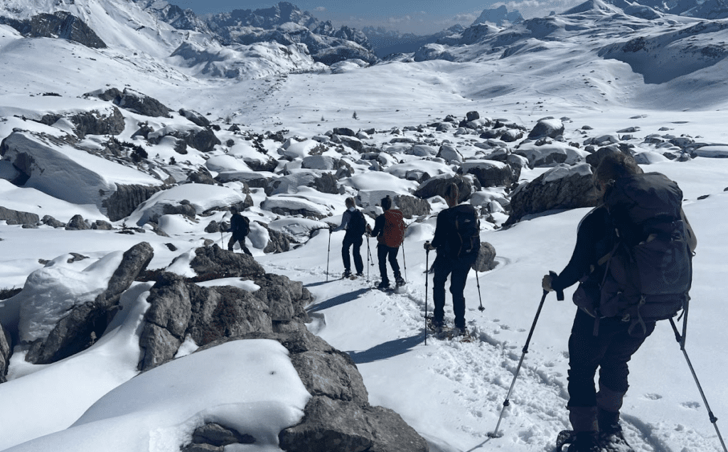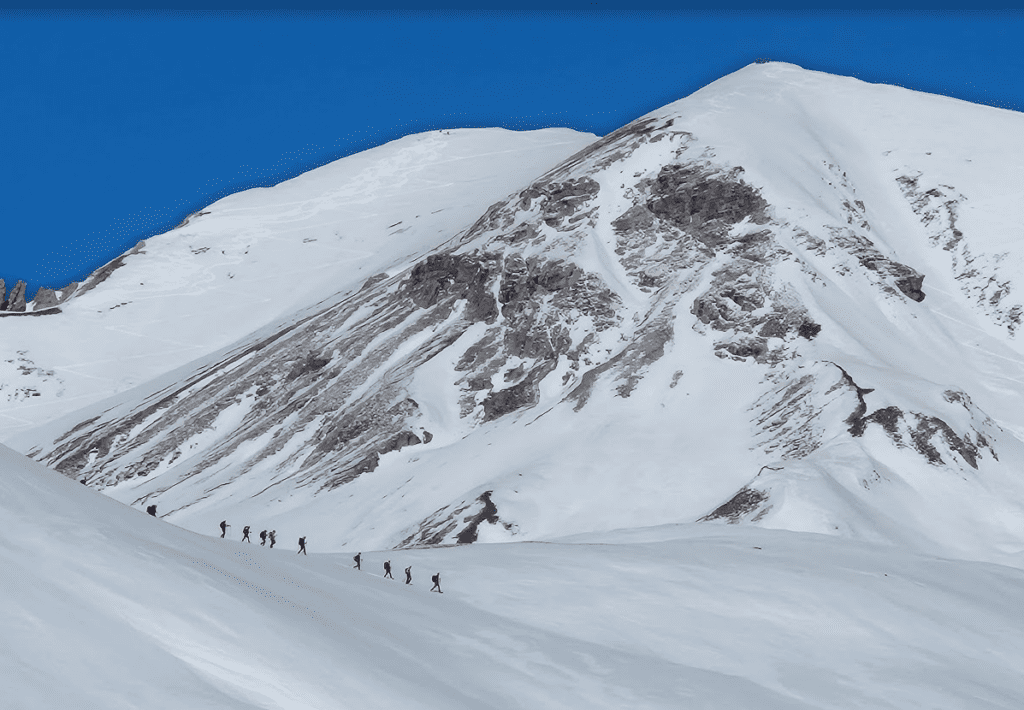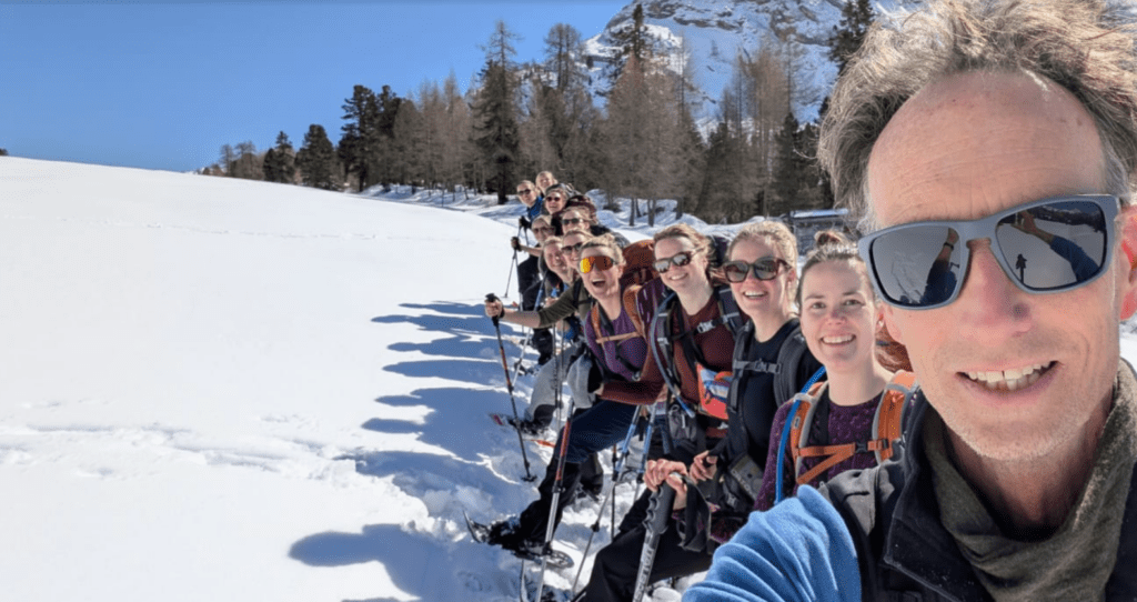 Al maanden keken we uit naar deze reis, die binnen een half uur vol was geboekt nadat hij online kwam. Voor de meesten was dit de eerste huttentocht, voor anderen de eerste in de sneeuw. Enigszins zenuwachtig allemaal omdat, ja, wat moet je verwachten? Ben ik wel fit genoeg hiervoor? Heb ik wel de juiste spieren getraind? Heb ik wel de juiste gear aangeschaft? Hoe anders is 1000m stijgen in diepe sneeuw dan ‘gewoon’ bergwandelen? Hoe zit het met lawines? Gelukkig hebben we Jan. Jan is onze gids en neemt voor alles de tijd, denkt via whatsapp mee over welke backpack straps we moeten kopen of welke handdoek het handigst is en stelt ons gerust; we hebben mazzel met het weer (zon!) en ook is er enkel lawinegevaar 1, wat zo goed als nihil is. De bergen zijn nooit zonder gevaren natuurlijk maar met Jan durven we het wel aan!