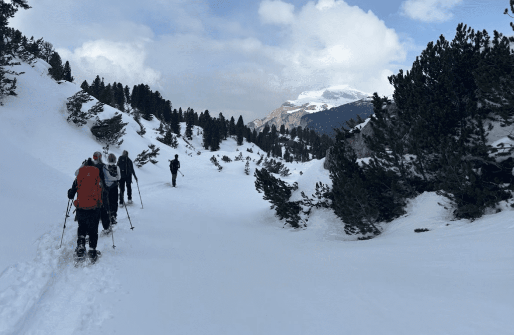 Het begint meteen door de sneeuw maar nog wel zonder sneeuwschoenen en ook direct lekker stijl. De route loopt door een prachtig sparrenbos en Jan vertelt regelmatig iets over naalden, sporen of andere dingen die we onderweg tegenkomen. Dit is wel prettig, kunnen we ook even uitrusten 😉 want het is een pittige klim. Later wordt de sneeuw dieper en gaan de sneeuwschoenen aan met hulp van Jan. Aangezien wij de eersten zijn die op dit stuk lopen sinds de vorige sneeuwval creëert Jan ons eigen pad. Hoe verder achteraan de groep je loopt, hoe lichter het lopen is doordat de sneeuw al door de vorigen is aangestampt.