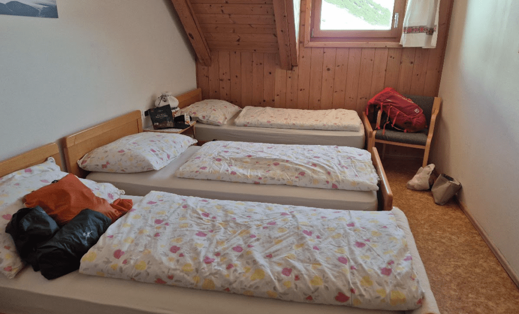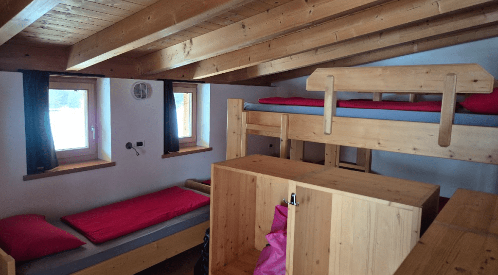 De hut is heel knus, alles van hout met foto’s van bruiloften in zomerse bergweides en ongetwijfeld veel familieleden van de huteigenaren. We hebben kamers met 2, 3 en 4 bedden die al zijn opgemaakt. Jan denkt dat we een upgrade hebben gekregen 🙂 hier slapen we 2 nachten.