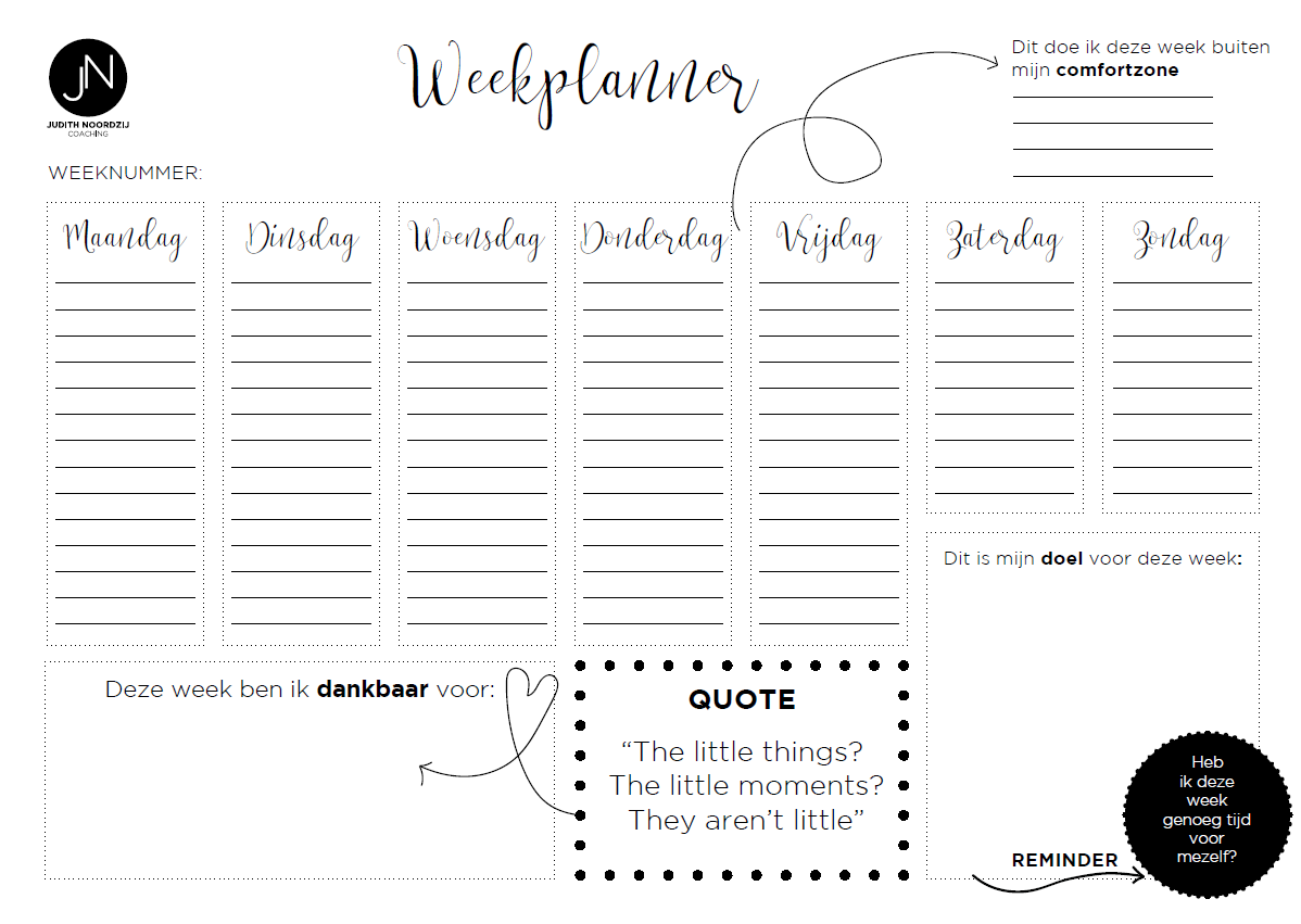 De weekplanner is niet gedateerd of genummerd. Je kunt dus zelf het weeknummer en de data invullen, zo blijven er geen pagina’s over als je de planner een week niet gebruikt. De planner bestaat uit 5 verschillende pagina’s die continu herhalen.